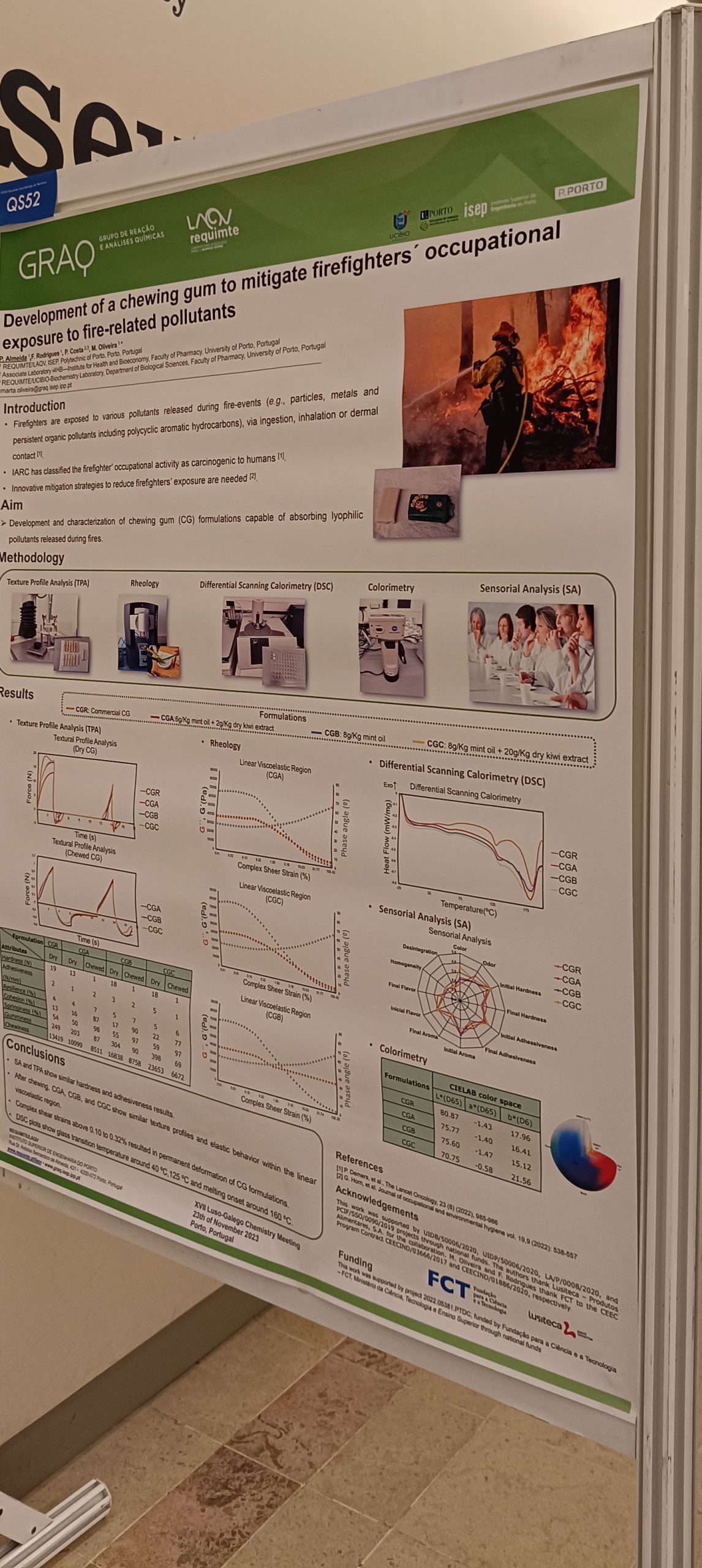 P. Almeida, F. Rodrigues, P. Costa, M. Oliveira, Development of a chewing gum to mitigate firefighters´ occupational exposure to fire-related pollutants, XXVII Encontro Luso-Galego de Química, pp. 302, 23-24th November, Porto, Portugal. ISBN: 978 989 8124 40 1. https://xxviilgq.events.chemistry.pt/pt/book-of-abstracts
